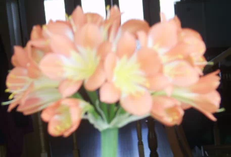 又拉了回来, 放在厅里考近窗子的地方,让阳光照着,让媳妇用水浇着。开花的株茎一天一天地从中间往上窜着。窜着窜着就歪向阳光常照着的那面。我把盆转了一圈,把歪向太阳的株茎转向了另一面。不几天,株茎长直了,也到年三十了。10多颗花骨朵结着,向上仰着。